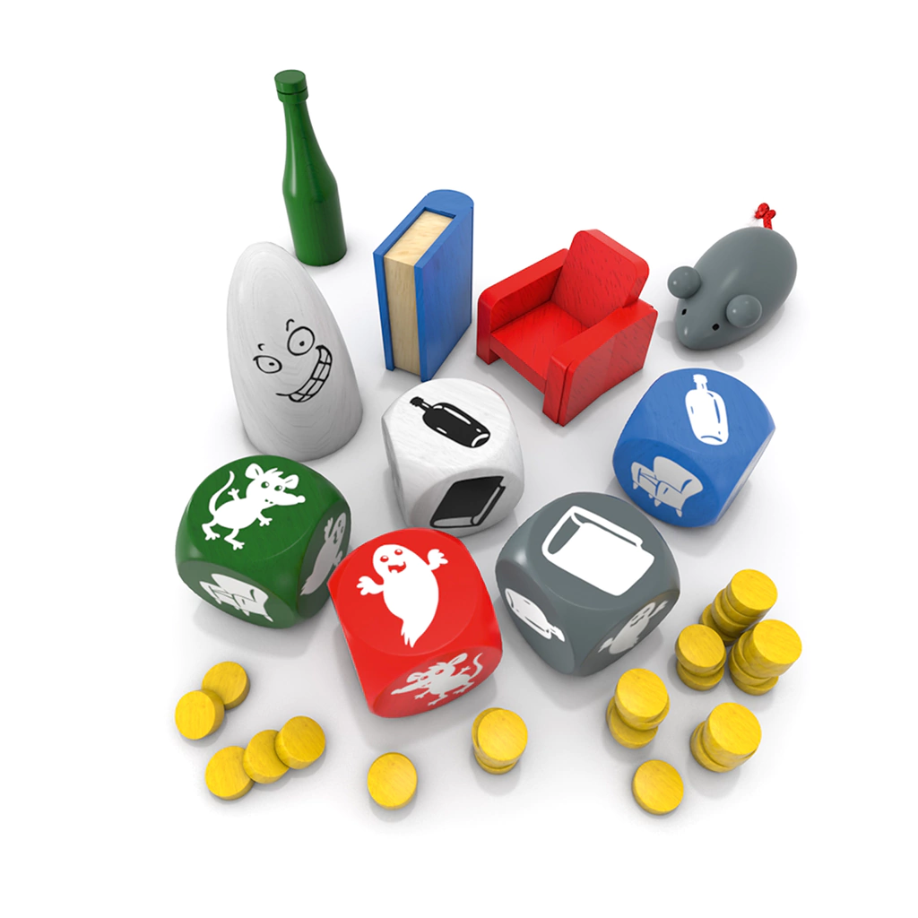 No centro da mesa estão os cinco itens típicos do Fantasma Blitz: livro, garrafa, poltrona, ratinho e fantasma. Mas agora não há cartas e sim dados! Um novo desafio e novas regras para o fantasma mais rápido do mundo dos boardgames, e para jogadores com mentes atentas!